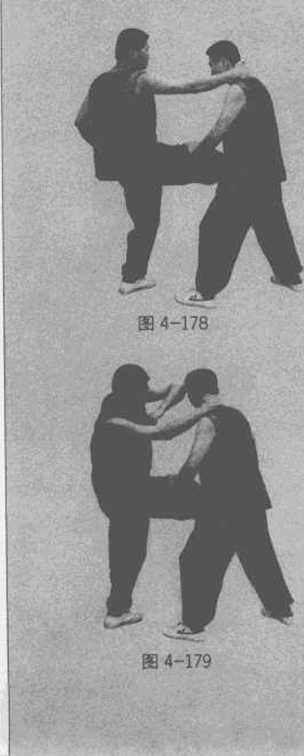 左肘以横扫肘打乙方头部此时被抱的脚便可以解脱(图4-179)