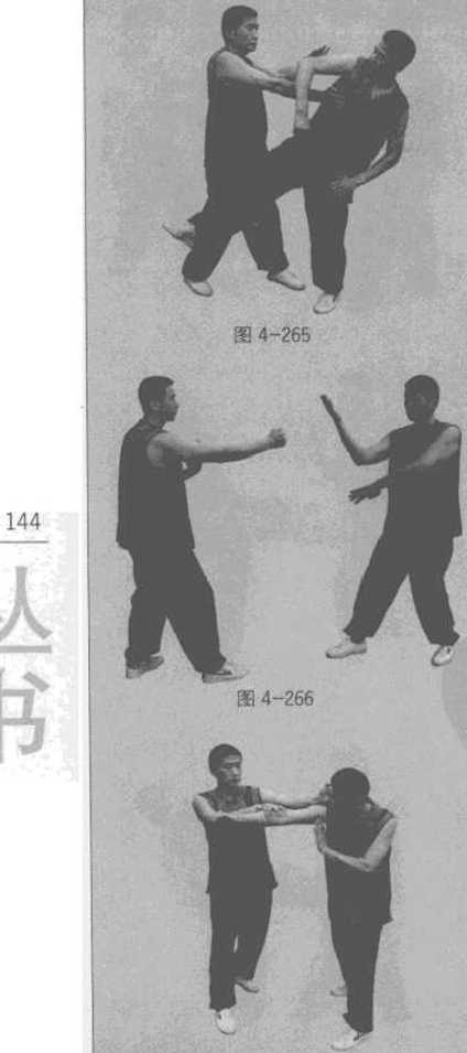 双方对峙准备格斗(图4-262)乙方突然起高脚攻击甲方的胸部。甲方即以右拍掌下拦乙方的来脚(4-263)突然上左马逼住乙方右侧门左手按住乙方右手(或托起)(图4-264)右横掌猛击乙方的右横掌猛击乙方的肋部(图4-265)。肋部(图4-265)。右横掌猛击乙方的右横掌猛击乙方的肋部(图4-265)。肋部(图4-265)。
