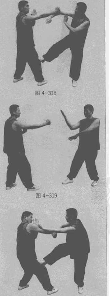 甲方以右马为前锋脚出右直拳攻击乙方的上路。乙方立即以右膀手接住来拳同时出右蹬脚踢甲方的膝盖关节位(图4-318)。