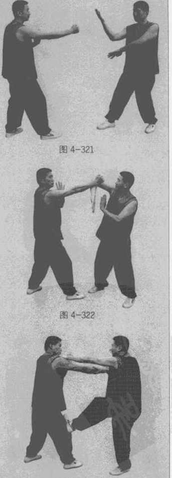 然后即转下拉手左手以杀掌封甲方的上路同时出右脚踢甲方的膝关节位(图4-323)