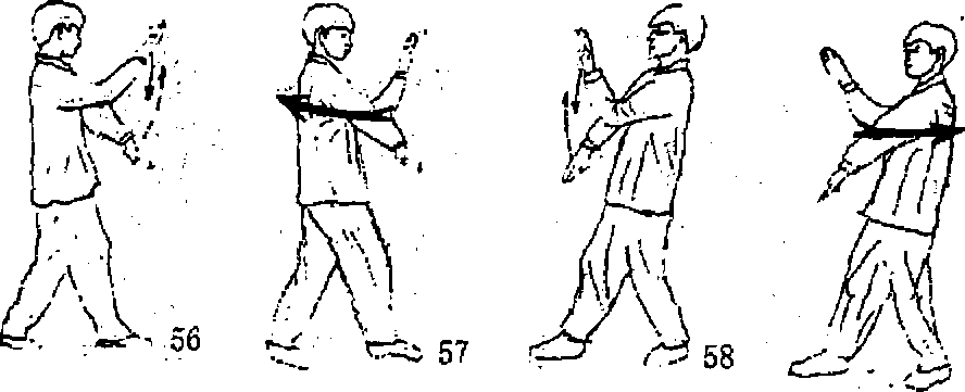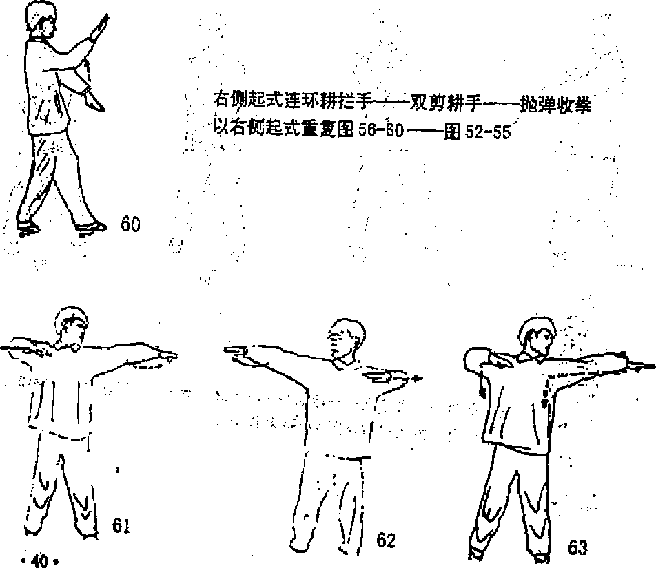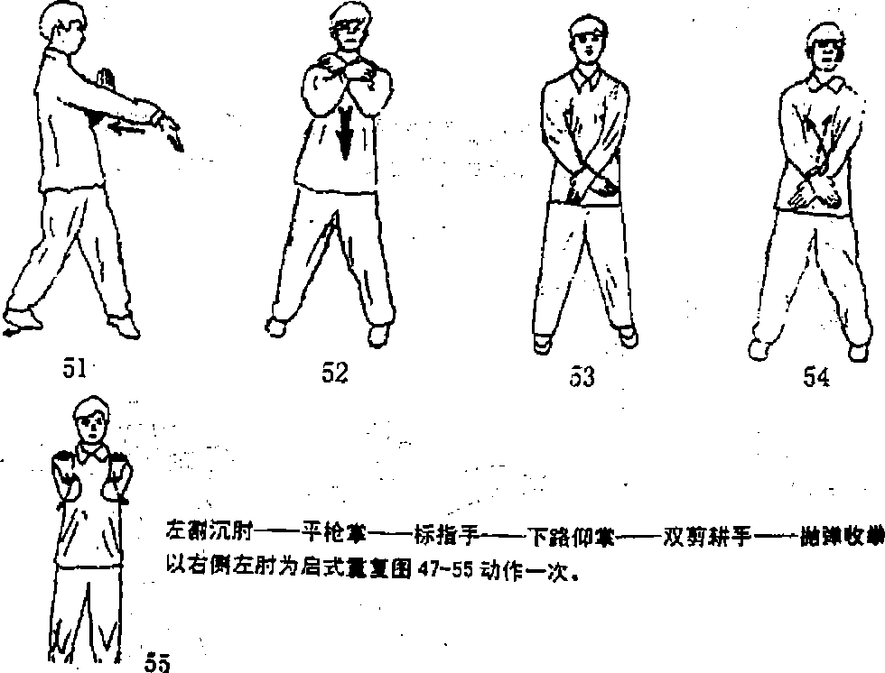 割沉肘——平地掌——标指手——下路仰掌——双剪耕手——抛弹收学(图47-55)