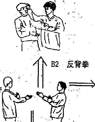 甲乙以咏春拄手对峙(图乙先欲以横掌击甲肋腹部甲转马避开乙搔拿并以左搭手粘住乙方桥手同时抛出右反弹背拳或董的砸在乙方领头或脸上(图2)熟练动作后甲力互换模拟练习