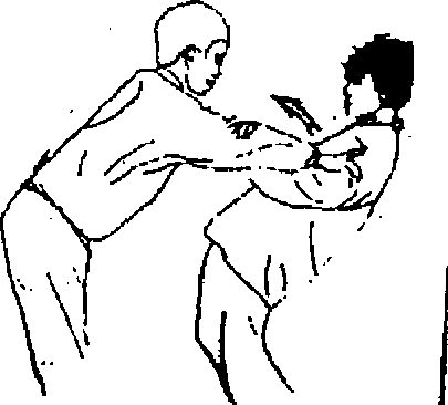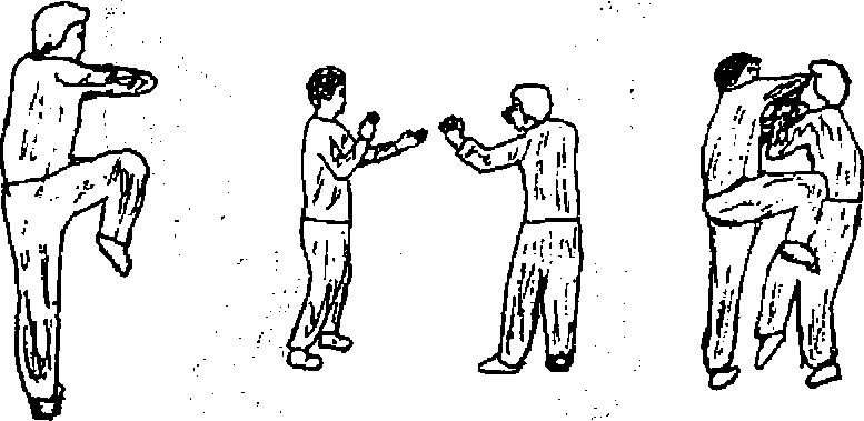 甲以咏春桩手乙以普通桩式对峙(图)。乙刚欲起腿攻击甲甲迅即箭步趋前以左手搭肩的同时,起右直撞膝和右批肘上下攻击乙(图)