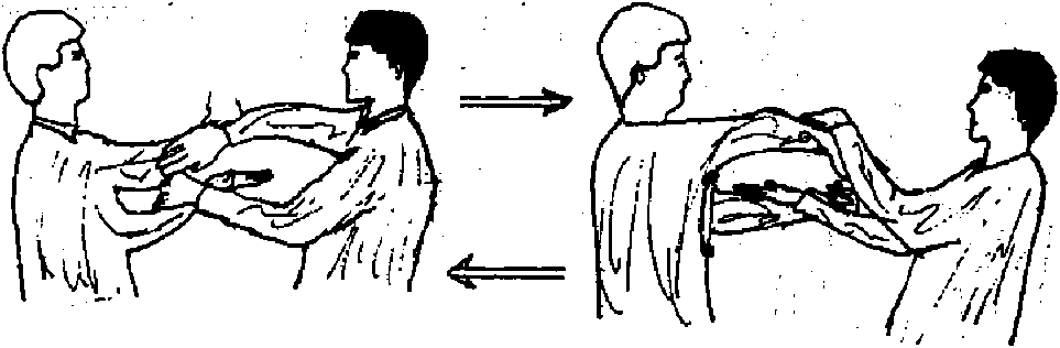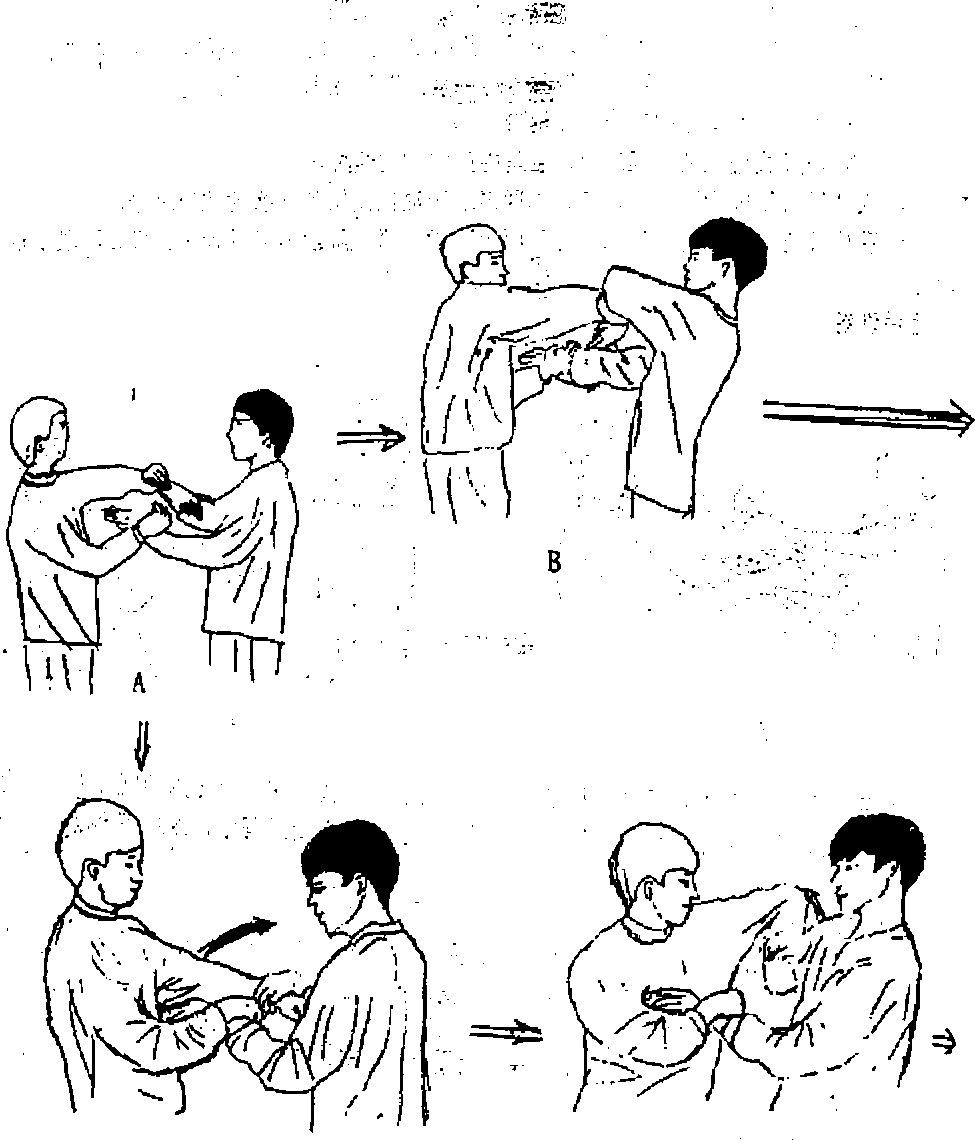 甲以右肠手左伏手乙以左伏手右摊手互相搭桥(图然后开始盘旋甲才双方伏手不变摊手变膀手,膀手则变摊手周而复始生生不息(图)