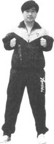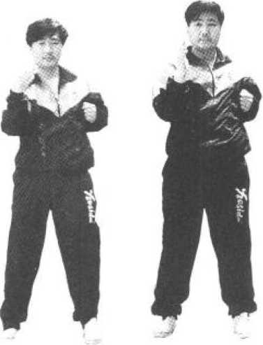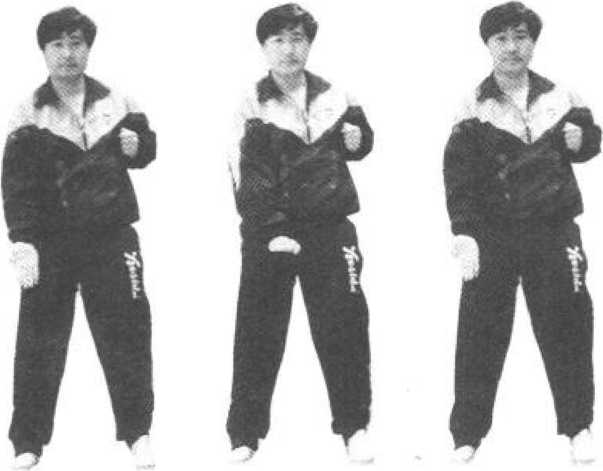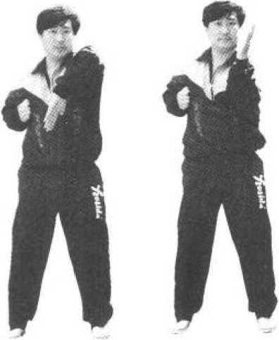 依上势,用肘把掌往上提,翘指成拜佛掌(留中),用 肘劲以腕行下摆指、外摆指、翘平指、握拳,用肘底劲拖回 成将台日字拳(见图230?图233)。