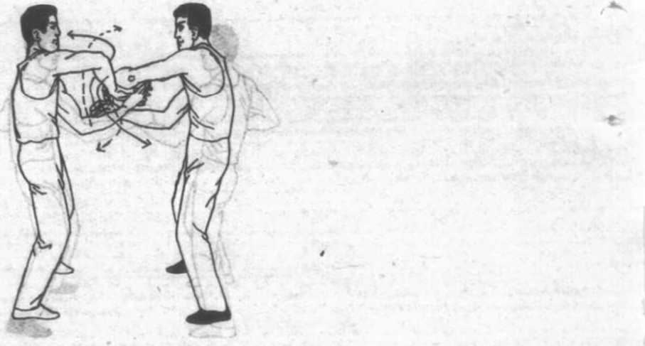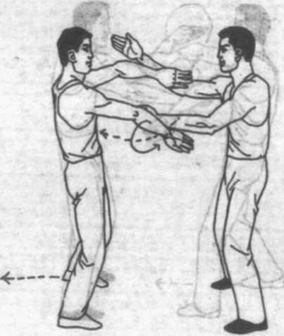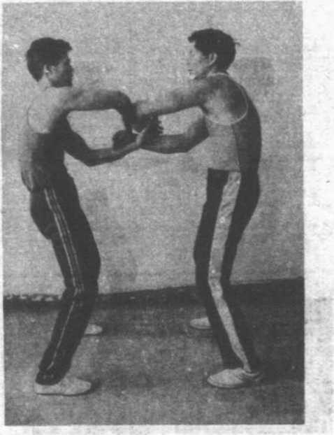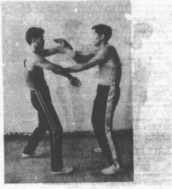 315预备式甲(右者)乙(左者)各成钳羊马两手腕相交甲右手内用作膀手乙左手外帘作膀手甲左手内帘作捧手乙右手外作伏手如是甲乙成为公捕手姿势然后乙左外帘用手腕勾住甲的左右两手腕316乙右腕内臂内旋由下而上用外横掌向甲耳旁打出甲左下二桐转拦桥手消解乙方的右手,同时甲右臂内旋、转膀手消解乙方的左勾手