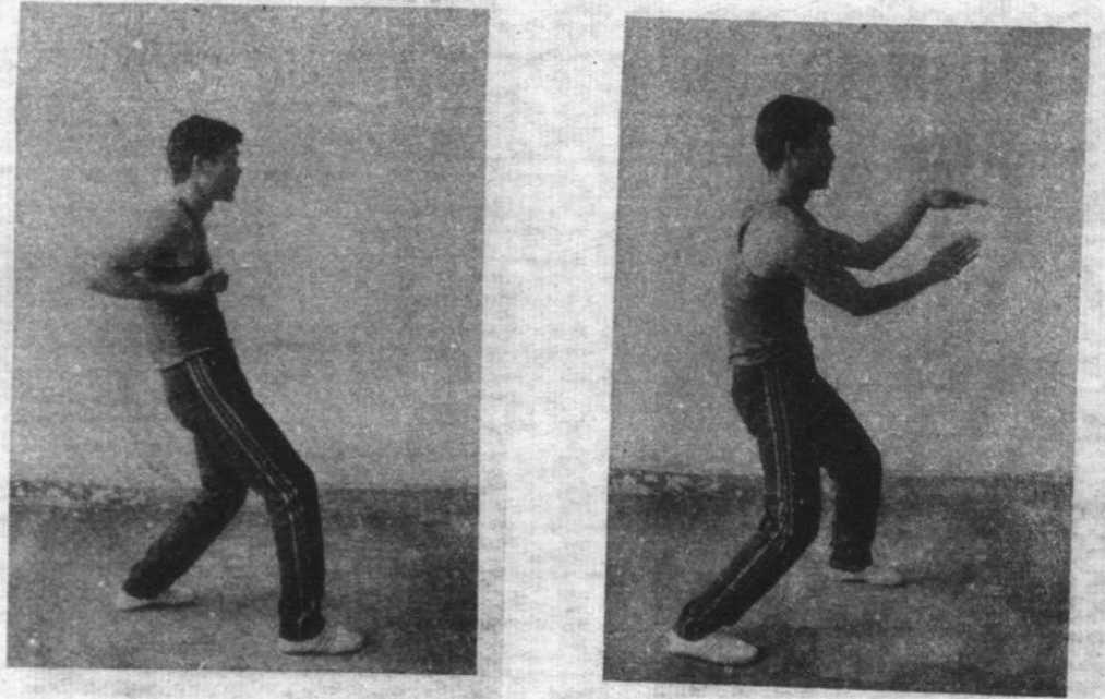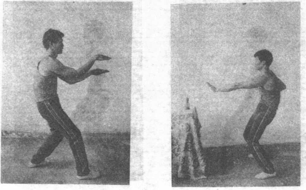 左转成二字钳羊马势撞腰、落膊、收胸,上体稍向下坐(坐马)左脚进步,右脚跟进如是连续进马二40左脚上步成二字钳羊马接着右脚再向前进步如是左、右脚交替进马 ,一41钳羊马势由进马动作左脚向后退步成二字钳羊马然后右脚后退如是左右脚交替退马(名为坐退马)42二字钳羊马势两掌向左作美女穿梭动作 二、11打灯