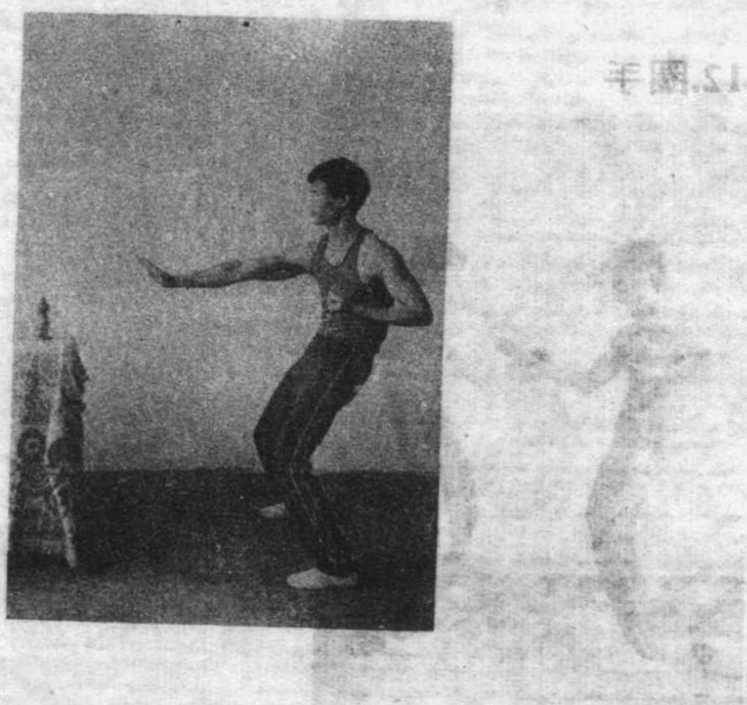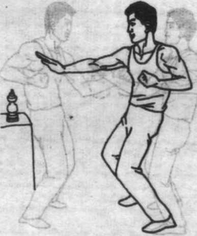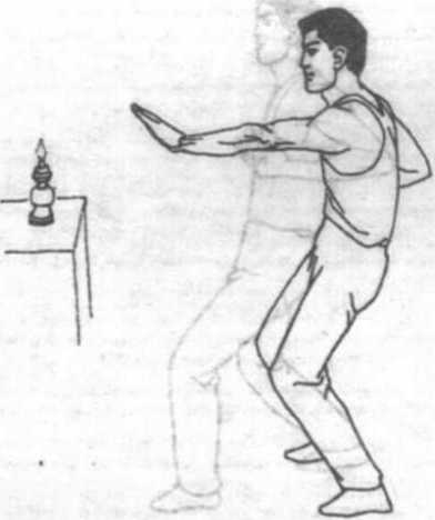 两掌向右作美女穿梭新作左脚进步向左做美女穿梭如是,交替练习要点练习上、下肢动作的配合可按走直线左线,,右线前线后线及肩面舷和四方形的方式练习444号煤油灯一盏点燃,以仅有火苗为宜灯的高度与心窝同高钳羊马势直臂以左掌心正对灯火,相距约20厘米45以左掌变拳回收的同时右拳变客向灯火打出以掌风打熄灯火要点打出时要神意归肘一即意念要集中以肘内侧发劲向前打出先右后,亦可用拳或横掌打以后逐步增长距离