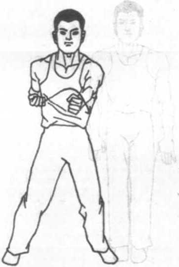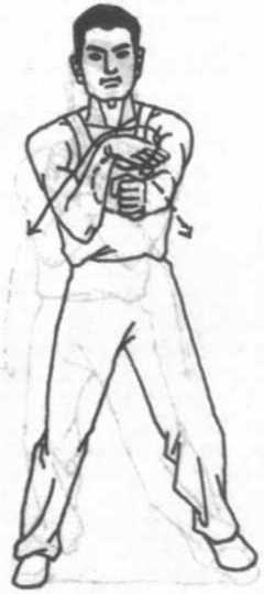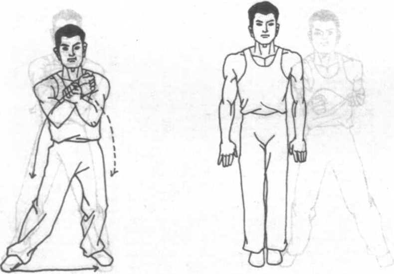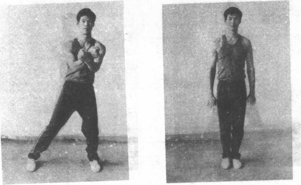 归肘向正前方打出拳眼向上与心窝成一直线右拳收至右胸侧254右拳变掌归肘臂内旋由心窝处以右腕内为力点擦过左腕内例直曾向前脱手打出255两旗外潮,两拳收至两胸侧右脚向左脚靠拢 256右脚向左脚靠拢立正两拳变掌向下按手指向前收式