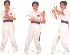 。以手腕带动腰向右施转45度右手大臂抬至与肩同高小臂向下左手向前推掌将劲力置于左觉及右手小臂上。(图3)。以手腕带动腰向右施转45度右手大臂抬至与肩同高小臂向下左手向前推掌将劲力置于左觉及右手小臂上。(图3)