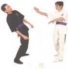 。对方以左手扣拨同时以右手击我腹部我右扑翼复击对方腮部将对方击退。(图5、6、7)