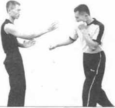 先以二字箝羊马站立(图224),当对方先用低位拳法向我方中盘攻来时我方速用左手向下削截敌方攻来击臂的腕关节(图225)将敌方攻击有效的破坏掉。谨记应在敌方拳头击至己方体前的瞬间才能去削截