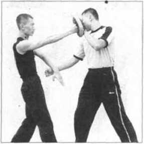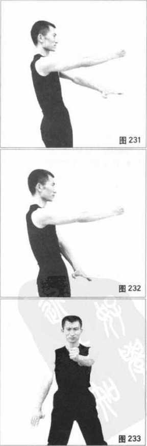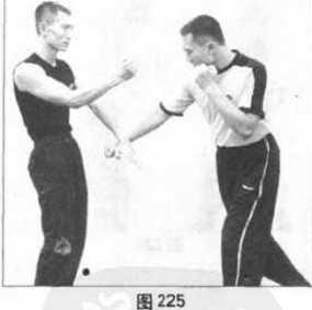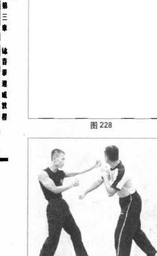 政手腕同时我方的右冲拳亦已狠狠击中敌方面门致命空当处(图228)而且不应就此罢手而应发起一阵连环快拳去最终击倒对手(图229)