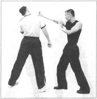 当我面对个左手居前的对手时(图171),仍町用前手迅速牵对方前手以便撕开其防线(图172)然后以一记快如闪电的右日字冲拳重击敌方面部致命空当处(图173接下来可再发出连串的致命创击(图174),直至对手倒地不起为止。这可能不是传统咏春拳中原有的动作怛却是一个突发性极强及实用性相当高的技巧动作而且即使是你第-次运用也同样能有效地击中对手,你还不赶快去试试!