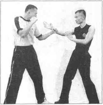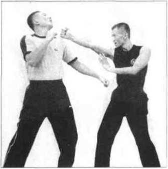 练习时我方仍与对方手搭手对峙(图166),正在双方瓦相试探、揣度之际我叮突然将右手贴紧敌方的右手臂并以伏手搭住其腕部,随后退速向自己的体后侧方向牵拉(图167),用以破坏对手的整体的防御姿势及防护效果然后不待对手反应过来我方的右手重拳早在突然向后-牵后乂迅速朝向正前方直线攻了出去(图168),目标是对手的下巴或口鼻三角区这一最为脆弱的要害区域。当然也可直接以连环重拳去封眼。记住紧接下来的又是一记摧毁