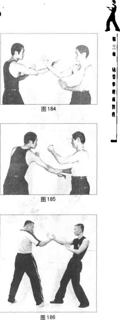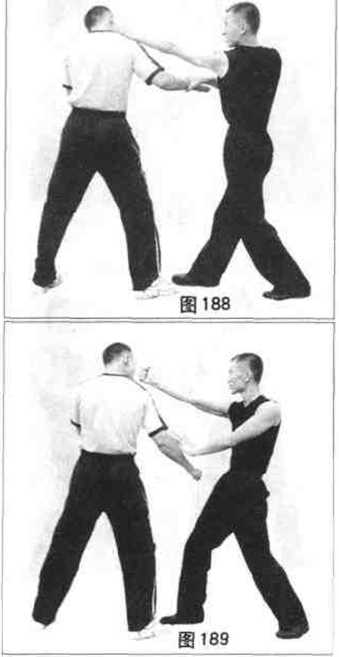 从上述动作分析我们可以看出己方的动作实际上是-个双手前后交错用力的动作过程你的前手上的向后牵带的动作不仅仅破坏了对手的防御体系同时也还会致使其重心随之前倾而恰好我方的左拳乂反向用力迎面打了上去导致对方的头面部与己方的拳头撞在了一起由于此时双方的速度都极快故面撞击力也极强试想是对方的头面部要害处硬还是你的经过杀伤力与硬度训练的拳头硬呢?(图184185)为李小龙当年的两位咏春拳高足严镜海及黄锦铭所示范的一组有关本招法的标准打法从图中可以清楚地看到右方的严镜海的动作几乎是双手同步动作的以庾尽量缩短对手可以做出的反应时间。