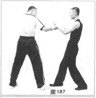 练习时敌我双方均以前锋桩对立(图186),我方则应注意观察对手的面部表
