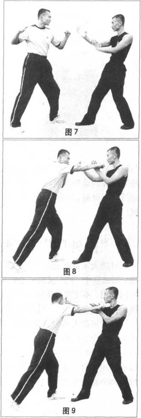 出的截拳道,都以那种简单、 直接、强劲、快速的直线攻 击动作为主(攻击动作通常 分为“直线攻击动作”和“弧 线形攻击动作”两种),原因 是由“直线”攻出的动作所 走的路线最短,与那些弧线 形动作相比,它节省了大量 的运动时间与运行距离,在 这种情况下,就算对手抢先 发起攻击,而我方却仍可后 发先至迅速准确地击中对手 (图7、8、9)。此种原理在初 中课本中已经学到,叫,两 点之间直线最短”。