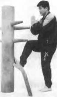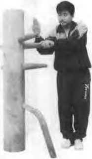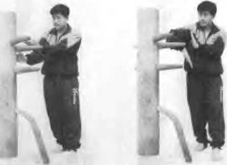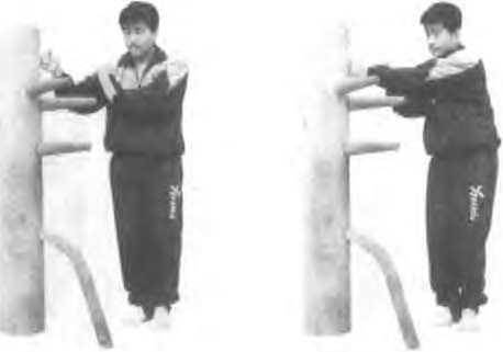 依上势身腰马左转收右脚成拍脚钳阳马左拳翩蚪抓住木桩的左手右护掌耕向木枇左手(见图53)