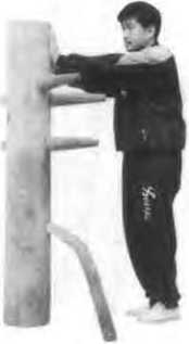 左摊手推向木饼左『外手右手成低掌直击木时腹部(见187)。