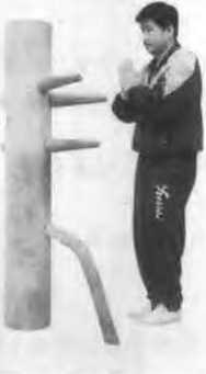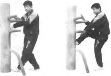 依上势左脚回收半步右脚刮向木桩下半部(由下向上刮)而左手拦木树下手右手耕木耕左手(见图58)