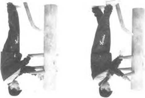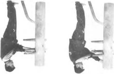 依上势身腰马右转寸木机左摊手转按手往下按住木桩下手右膀手沉肘争得内帘后由木桩左右手间直击木桩面部(见图62)