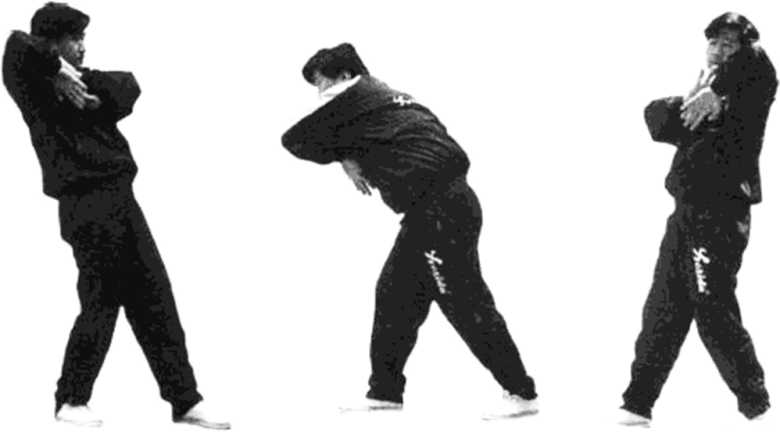 依上势,身腰转向右方,用左掌摸按右掌背,然后右臂 贴右耳根向左方压下,身腰前俯,目光注视正前方(见图