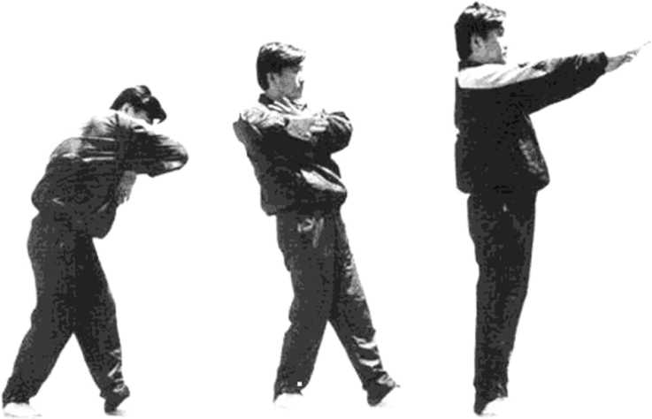 依上势,以长桥运气,用肘底劲拖回至将台成豹拳(见