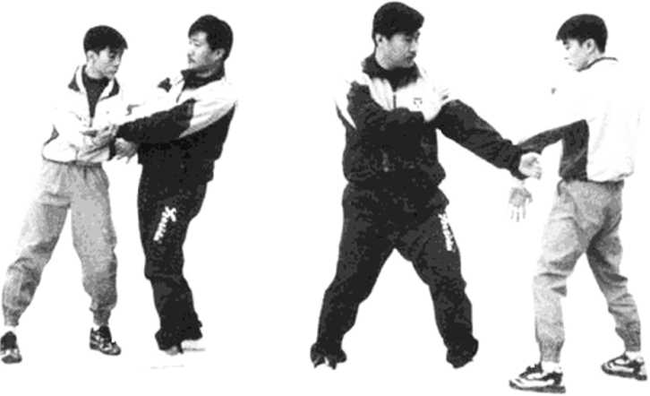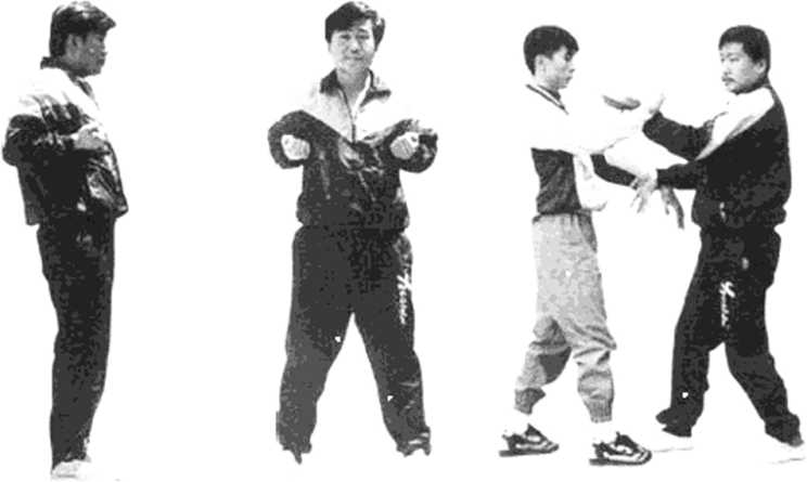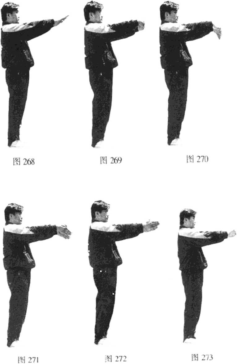 依上势,以双肩、肘、腕运气至指尖,发劲向外、内、 外插掌(见图268)。