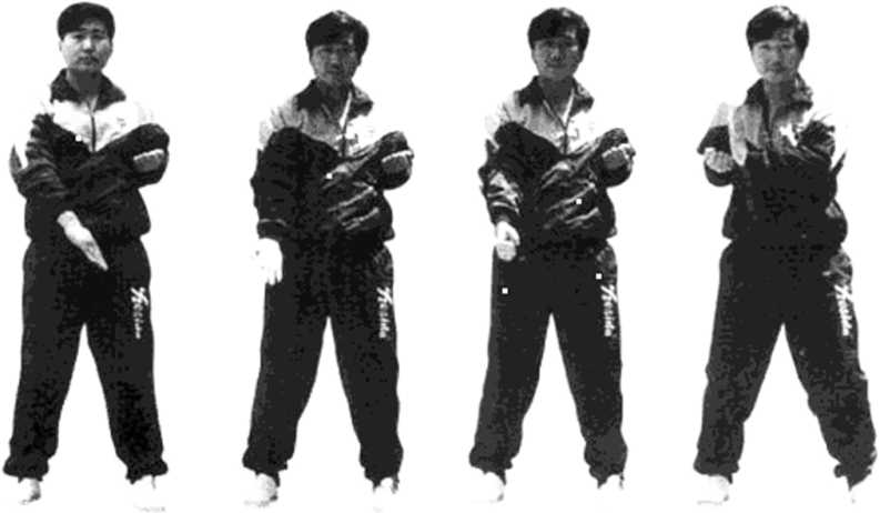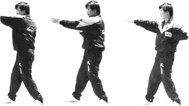 依上势,左豹拳化仰掌向前方直标,掌心向上成阳掌, 右阴掌收回成护掌(见图315).