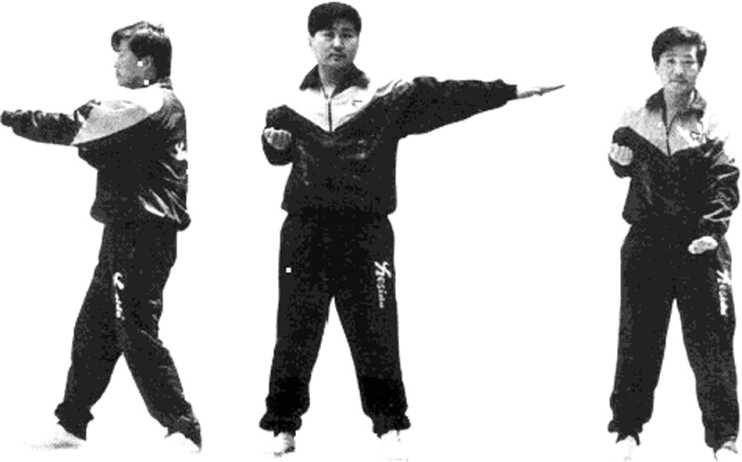 依上势,左仰掌化黏摸荡掌,身腰马同时转正,左掌摸 至右肩,四指左摆,收肘至左肩直标出左方(见图316)。