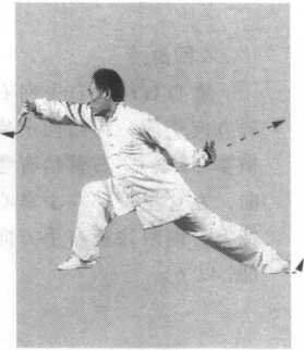 (5)右脚调顺,左掌 向左腿方向推进。五指自 然竖起,掌心要空,虎口 撑圆,右手随之翻转,前 臂里旋,掌心向上,左膝 前弓,右腿挺直,眼要正 视左手方向(图4.2.5)。
