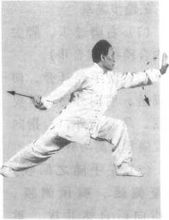 图 4.1.11图 4.1.11(1)叶下藏花时,进步、 扭腰,两手脚齐动,右手缠身 穿于左腋外侧,两脚抓地,不 准在地面拧转,腰要尽力扭 转,角度越大越佳。身体成半蹲姿势,切勿突起。