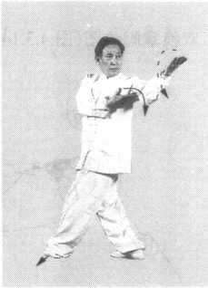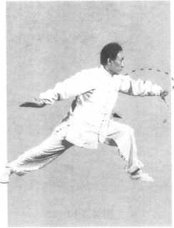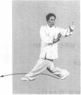 两手不停,同时分别 向前、后挑起,右手与眼 平,立掌前推。左手翻转, 掌心向上,手掌翘起,左 肩里扣下沉。目视右手。 右膝弓起,左腿挺直(图 4.3.8 )0