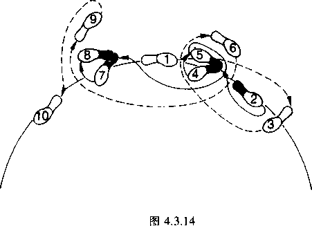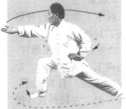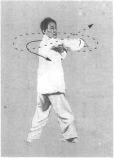 重心右移,右脚尖外 摆。左脚进步(扣步),扣 于右脚之前,同时,左手 贴肋旋至右腋下,手指位 于肩外,掌心向上。右臂 撑圆,掌心向外,顶项垂 肩,同时向右转体,左手 指向圈心,目视左手方向 (图 4.3.11)0