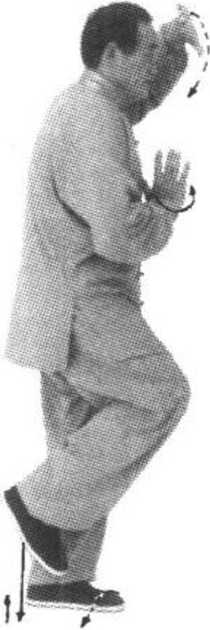 (2)身体继续左转(胸向东北),随即左脚向东北上步,重心移 至左腿;右脚跟步至左脚内侧(脚尖约与左脚踝骨一齐。下同),脚 不落地,膝微上提;同时,左臂内旋向上架于左额上方,手心向前, 指尖斜向右上方;右手坐腕立掌,指尖朝上,手心偏向北,拇指贴近 心窝,肘贴右胁,待重心稳定,快速发力推掌震脚(脚底展平,用虚 脚弹震,身体不要有起伏;推掌发寸劲,不要牵拉身体晃动,下同); 眼向东北平视(图64)。