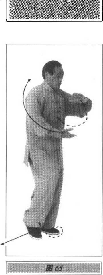 (3) 重心移至右腿,左脚内扣,重心移至左腿,右脚跟内碾成虚 步;同时,身体右转,右手外旋置于左腹前,屈肘,手心向上;左手落 于左胸前,屈肘,手心向下,两手成抱球状(图65)O