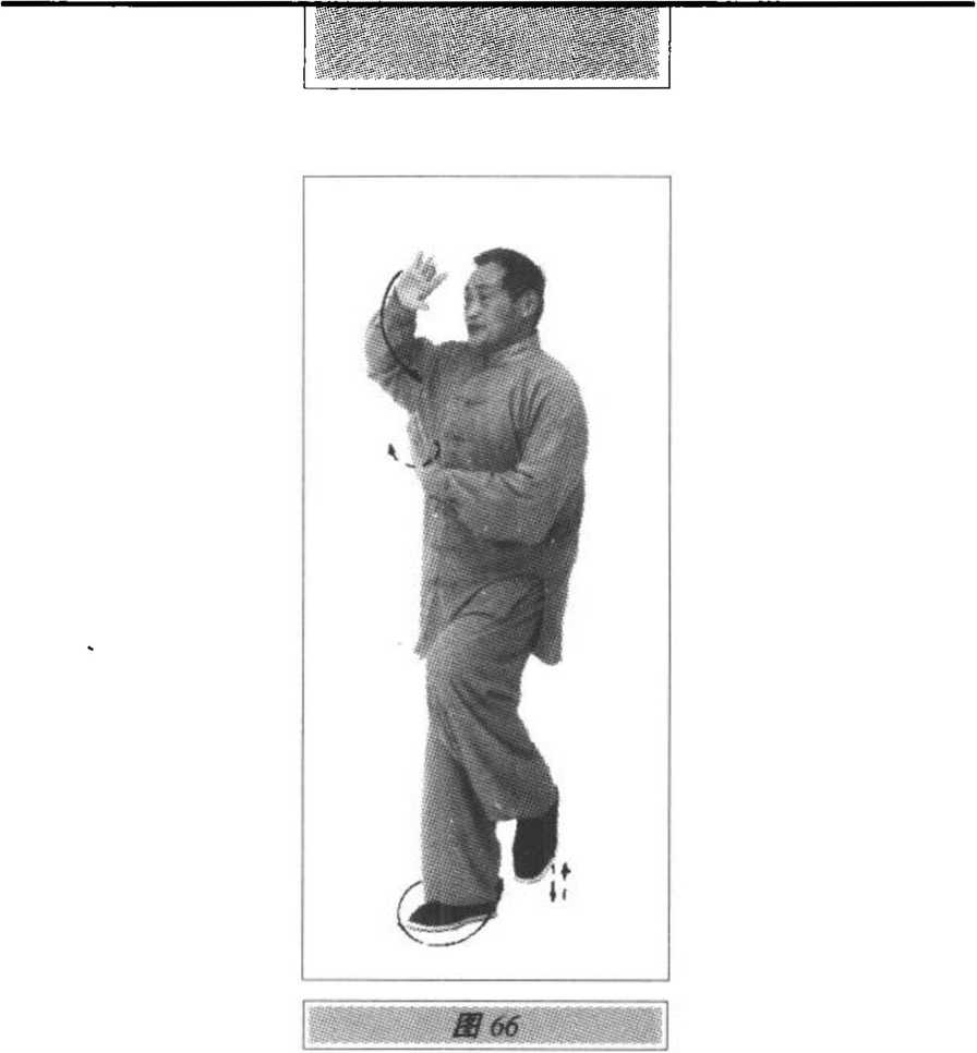 (1)±体直起,向左转体;右脚以前脚掌为轴,脚跟向外碾转, 重心移至右腿;左脚也以前脚掌为轴,脚跟抬起内碾成虚步;同时, 右手先外旋再内旋,向右、向上、向左划弧,手心向下;左手上提外 旋,手心向上,两手在右胸前成抱球状(图63)o