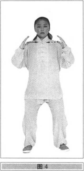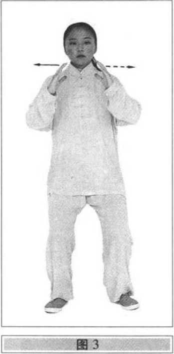 ⑴身体重心(以下简称重心)移至右腿,左脚先抬脚跟, 然后全脚抬离地面(脚尖不擦地即可),慢慢向左分开约半 步,先前脚掌着地,然后全脚踏实,重心移至两腿间(两脚相 距与肩同宽,脚尖外撇度数不变);眼平视前方(图2)。⑵两手臂(先外旋后内旋)向前上方拖举至腹前;同时, 两腿屈膝坐身,敛臀收腹(膝盖与脚尖成垂线,以下的弓步 均应如此);两臂屈肘,两手向胸前划弧回收,指尖朝上,高 与肩平,手心相对,两手相距约脸宽,拇指与肩距离约20厘 米,两手臂成塔形,两手心微含,手指微屈,自然散开;眼看 两手间(图3)。