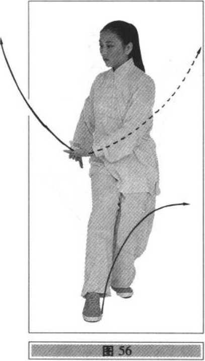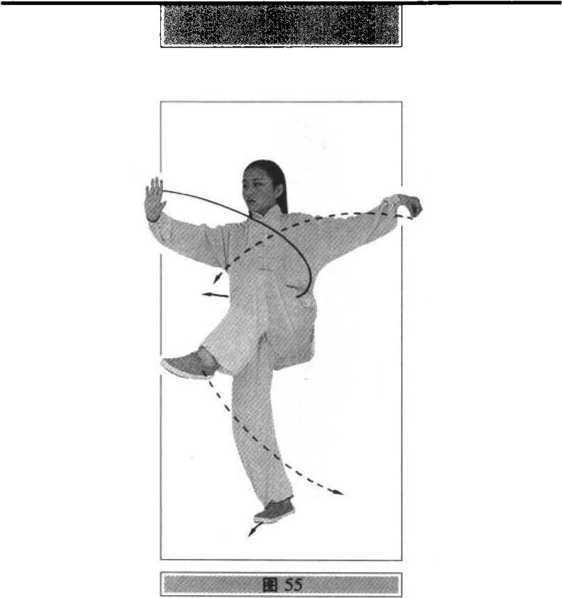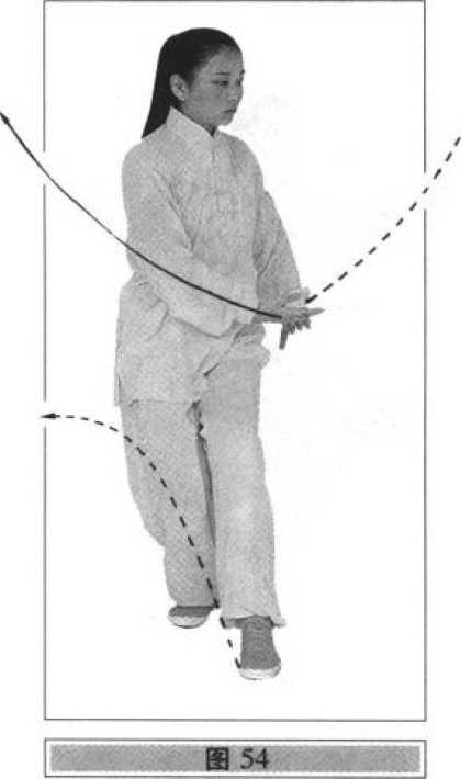 ⑶上体微右转,右腿独立站稳;同时,左腿向右前方抬 起,膝微屈,脚面展平,脚尖稍内扣;右手臂内旋,向右前方 划弧举起,坐腕,指尖朝上,手心斜向前,腕略高于肩;左手 变勾手,举于体左侧上方,腕略高于肩,勾尖向下,两肘微下 沉;眼看右前方(图55)O