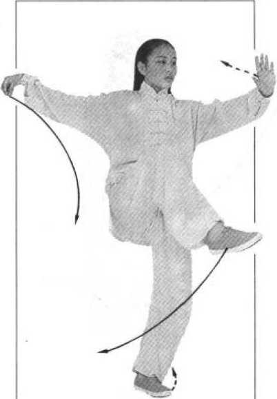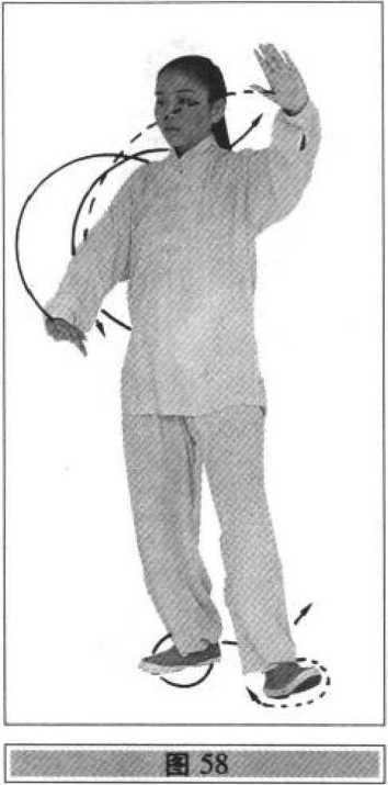 (1)上体先微左转后右转,左脚落至右脚内侧,重心移至 左腿,右脚移至左脚前?,前脚掌虚着地;同时,右手臂内旋, 向左、向下经腹前划弧至右胯旁,手心朝下;左勾手变掌(手 臂外旋)向右经胸前向下划弧至右胯前,手心朝上;眼看右 下方(图56)O⑵上体左转,左腿独立站稳;同时,右腿向左前方抬起, 膝微屈,脚面展平,脚尖稍内扣;左手臂内旋向左前方划弧; 右手变勾手举于体右侧上方;其他动作与技术要求参照右 式(图57)。
