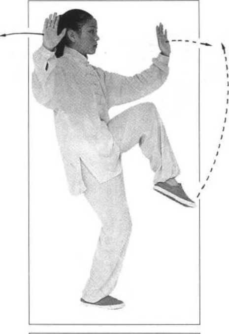 接图68。右拍脚后,右小腿屈收下落,身体微下降,在 脚未落地之前,左脚蹬地使身体向上腾空,在空中左腿迅速 向前上方踢摆,腿伸直,脚面展平(脚蹬地起跳时,要提气; 身体腾空击拍时,要屏气托住);与左腿向上踢摆同步,左手 向前拍击左脚面,右手向后、向上划弧至身体后上方,手心 向外;眼看左手(左拍脚后随即右脚落地)。S72