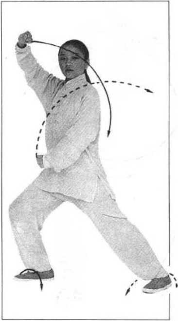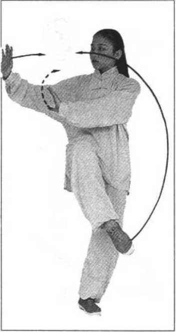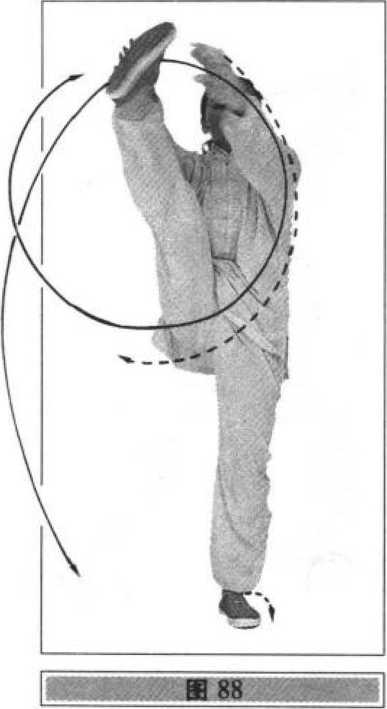右式(定式面向南)⑴上接图85。右脚向左脚后落步,重心后移至右腿,上 体右转(面向南),左脚尖内扣,重心移至左腿(坐胯、膝微屈、腿站稳),右膝上提至腹前,小腿微外旋,脚面展平;同时,两 手随转体向右划弧,右手举于体右侧,手心向右前方,指尖 向上;左手举于右肩前,手心向右,指尖向上;眼看右前方 (图 86、87)。⑵右脚提起向左、向上、向右扇形摆脚,脚面展平;同 时,两手自右向左摆掌,在体前左先右后拍击脚面(击声两 响);眼看两手(此为右摆莲脚)(图88)。M—M——憎