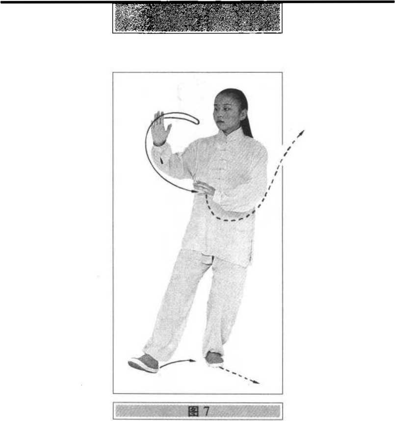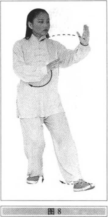 ⑵重心移至左腿,右脚向西南上虚步,脚跟着地,脚尖 上翘,膝微上提(腿不可挺直);同时,右手再稍向左划弧变侧 立掌,向右腿上方挑举,手心向左,指尖斜向上,高与眼平 (右肘、膝上下成垂线;指尖、脚尖与鼻尖三尖对齐);左手向 左、向下、向右划弧合于右前臂内侧,手心向右(左手与右臂 相距约15厘米);眼看右手食指(图7)o