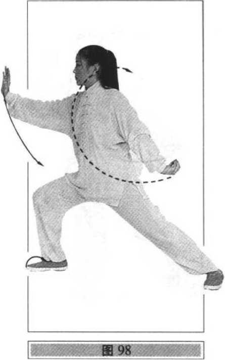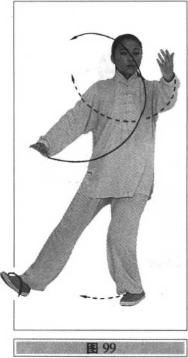 碾,左腿自然伸直;同时,右手向前、向上挑掌,指尖斜向上, 手心向左,高与眼平;左手臂内旋下落,勾尖向上(勾手与臂 不要接触臀部);眼看右手(图97、98)。