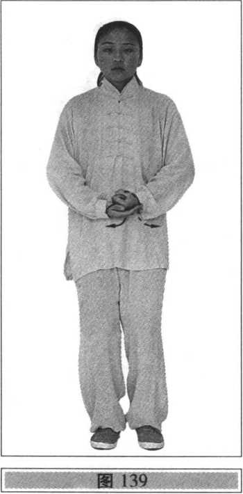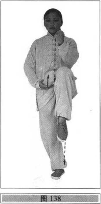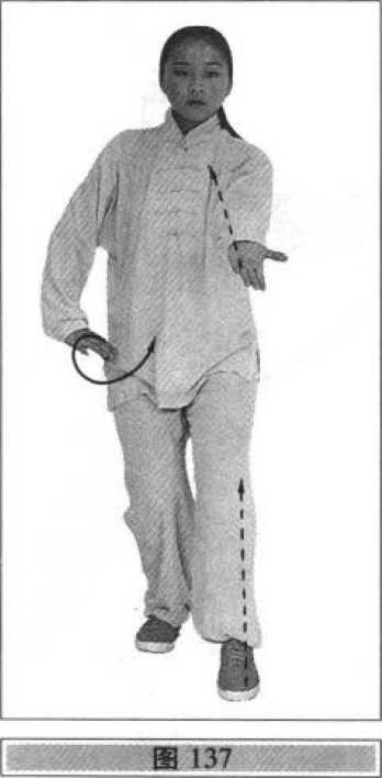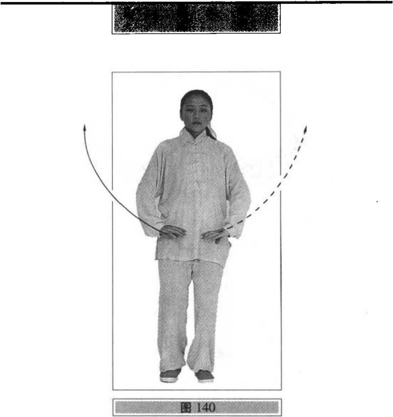 右脚落实,重心移至右腿,左脚以脚跟内缘擦地向左横 开一步(脚尖稍外撇),重心移向左腿,左腿侧弓,右腿自然伸直;同时,右拳变掌向体右侧上方划弧,手心和指尖斜向上;左手臂内旋翻手心向下,稍向左划弧,继而两手随着重心左移和腰、胯、肩向左拧转,右手(手心向上)向下、向左划弧至左胯前(手臂内旋,手心向下)再反向右划弧至右胯旁;左手向左、向后划弧(手臂外旋)向前撩掌,手心向前,指尖斜向下;与右手向右划弧和左手前撩同步,上体微右转,重心移向右腿,左脚经右脚内侧向前出虚步,前脚掌着地;其他动作 与技术要求参照右式(图136?139)。