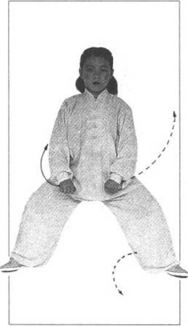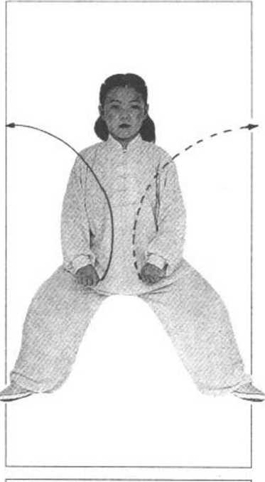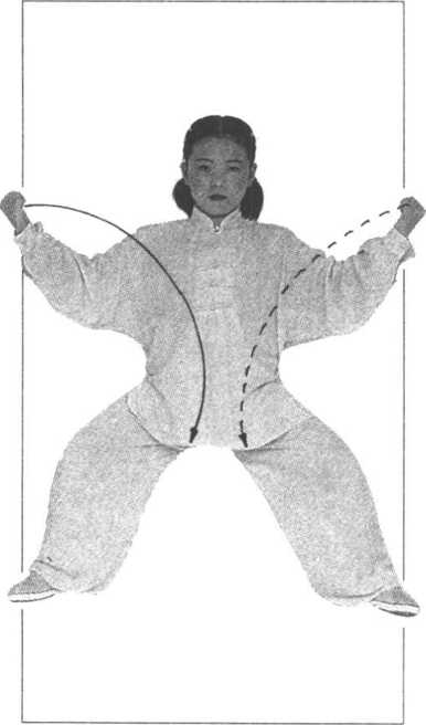 重心稍后移,身体左转90。(面向南);同时,两脚以脚跟 为轴,右脚尖内扣,左脚尖外撇,两脚成马步(重心移在两腿S51间,裆微下沉,敛臀收腹,上身正直);右手变拳与左拳同步 (两臂内旋)向左划弧至腹前,两拳面朝下,拳眼向内,两臂成 弧形,随后两拳上提至胸前(两拳面相对),两臂外旋,两拳一齐分别向体左右两侧摆击,腕与肩平,沉肩垂肘,拳心向 上;眼平视前方(图50?52)。图53