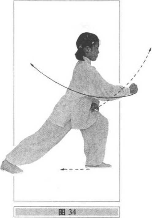 ⑴重心后移,上体微右转,右脚向后退步,重心移至右 腿;同时,右拳先内旋后外旋稍向右,再向后划弧收拳于腰 间,拳心向上,拳眼向外;左脚向前(东)上步,脚跟着地;左手 先向下划弧至腹前,再向左、向前划弧举于体前,手心斜向 上;眼看左手(图33)。⑵左脚再稍向前上步,重心前移,左腿屈膝弓步,右腿 蹬伸(膝部微下沉);右拳内旋立拳向前冲打,肘部微屈,拳眼 向上,拳高与腹平;同时,左手向后拦收至左腹前,臂成弧 形,手心斜向下;眼看前下方(图34)。图35