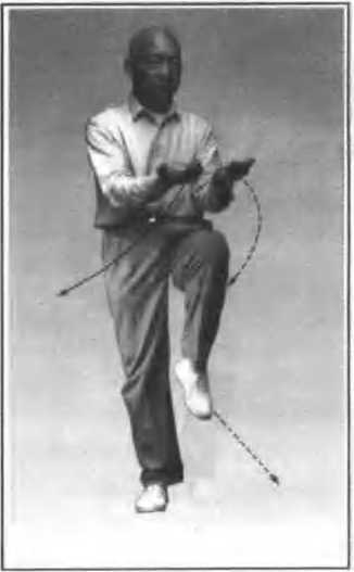 8. ,以左脚跟为力点,向左前 (偏东约30度)慢慢蹬出;同时两手由上走弧形, 分展于左前和右后,手指向上.两臂呈弧形,肘 尖向下;眼看左掌(图47):9. 上体稍左转,左腿屈膝、脚尖F垂;右手 向前平伸于右胸前,手心向上;左手手心转向 上.两臂稍屈,平行落于左膝L方,肘尖向下; 眼看前方(图48),10. 左脚向前落下.脚跟着地;两手向下向 后走弧形,经胯的两侧时.握拳向前弧形贯击. 同时左脚踏实,成左弓步;拳高与耳平,相距同 头宽,拳心斜向下;眼看拳方(图49、50)。951951951951