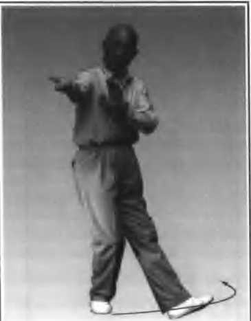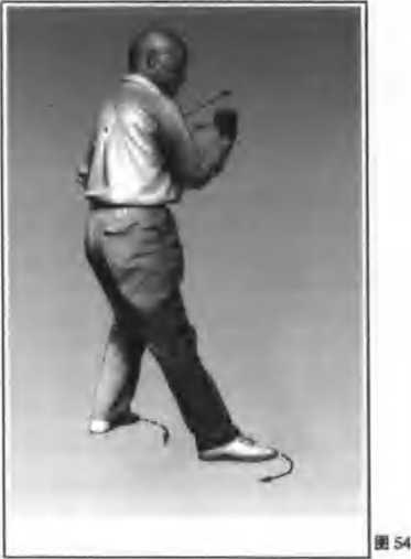 2. 身体左转,左脚掌踏地.右脚并于左脚内 侧.手随体转;眼看右手(图53)。